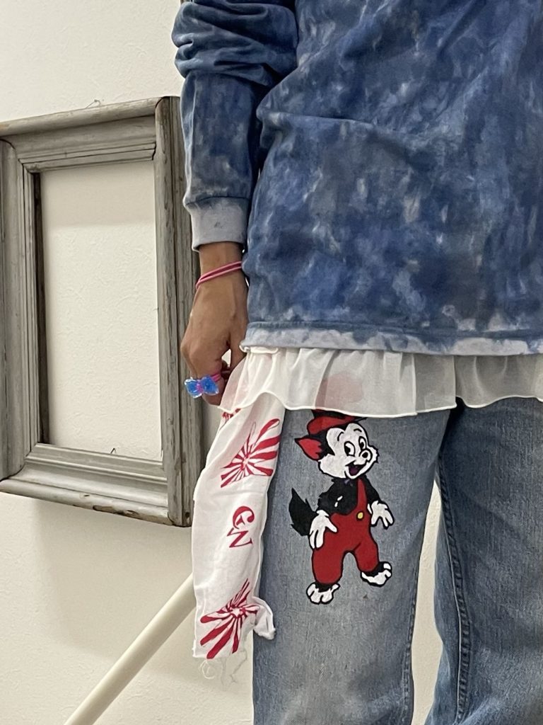 そこにシルクスクリーンプリントを重ねることで、アートとファッションが融合した表情豊かな仕上がりになっています。
