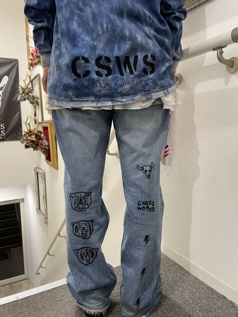 そして、さりげなく腰に付けるだけでスタイリングのポイントになるCHAOS WORKSオリジナル手拭い。