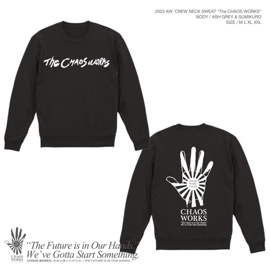 CHAOS WORKS New item CHAOS WORKS Crew Neck Sweat カオスワークスから新作のクルーネックスウェット近日発売決定です!!発売日に関しては追って発表します! 「未来は僕らの手の中」をモチーフにしたデザイン 今回プレスリリースされるクルーネックスウ... -